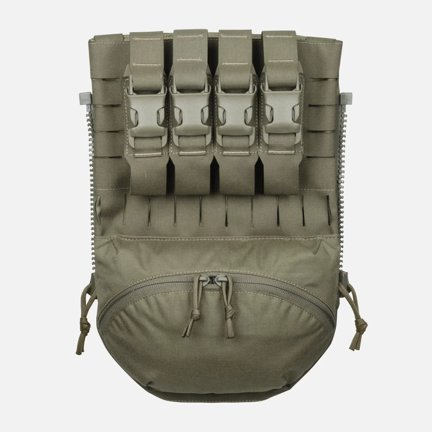Сама панель служит в качестве тонкого транспортировочного рукава для гидратационной камеры или инструментов для вскрытия отверстий. Застежка на крючок и петлю внизу открывается для размещения более длинных инструментов, таких как кувалды, которые можно переносить вертикально и закреплять сверху.