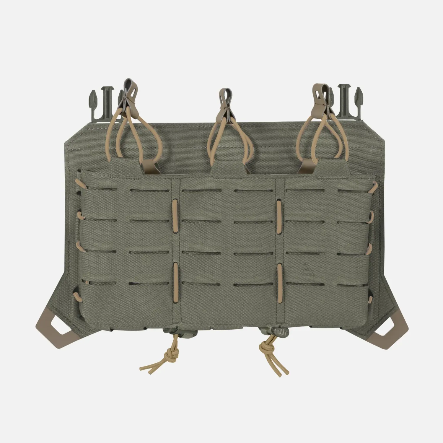 ТРОЙНОЙ КЛАПАН МАГАЗИНА ВИНТОВКИ имеет одна из дополнительных заслонок, доступных для системы SPITFIRE®.ых для системы SPITFIRE®. Регулируемый тройной подсумок для винтовки, пришитый непосредственно к клапану, позволяет носить три магазина для винтовок AR, AK или SR на платформе. Магазины также крепятся сверху с помощью эластичных шнуров с противоскользящими фиксаторами Hypalon®. Клапан почти полностью изготовлен из фирменного ламината, который не только гарантирует долговечность, но и немного жестче, чем стандартная Cordura®, что позволяет легко убирать магазины в кобуру. Передняя поверхность откидной створки покрыта системой лазерной резки, совместимой с MOLLE/PALS, что обеспечивает дополнительную модульность. Откидная створка совместима с пластиночными креплениями SPITFIRE®, SPITFIRE® MK II и HELLCAT®. Клапан может быть прикреплен к держателю пластины через специальные отверстия в клапане или с помощью прилагаемых пряжек.