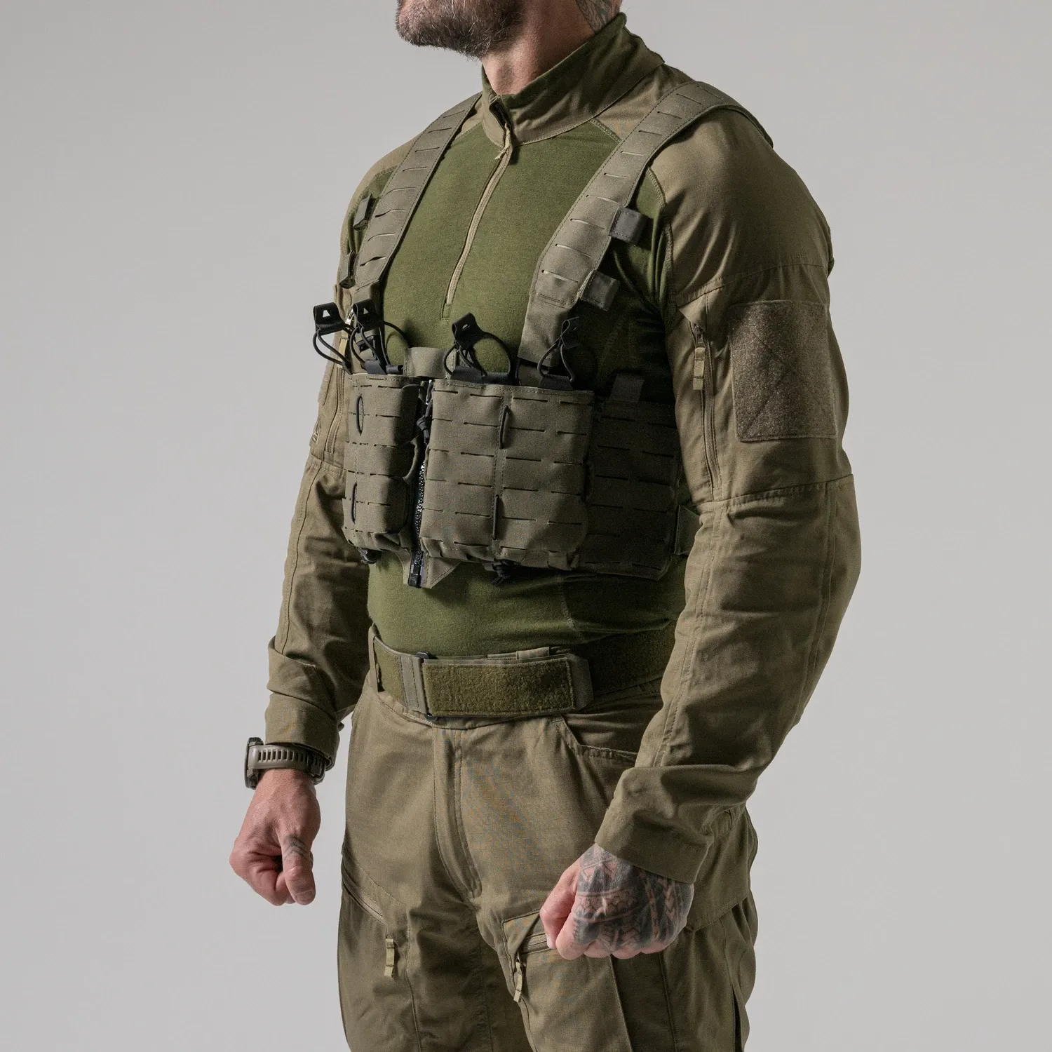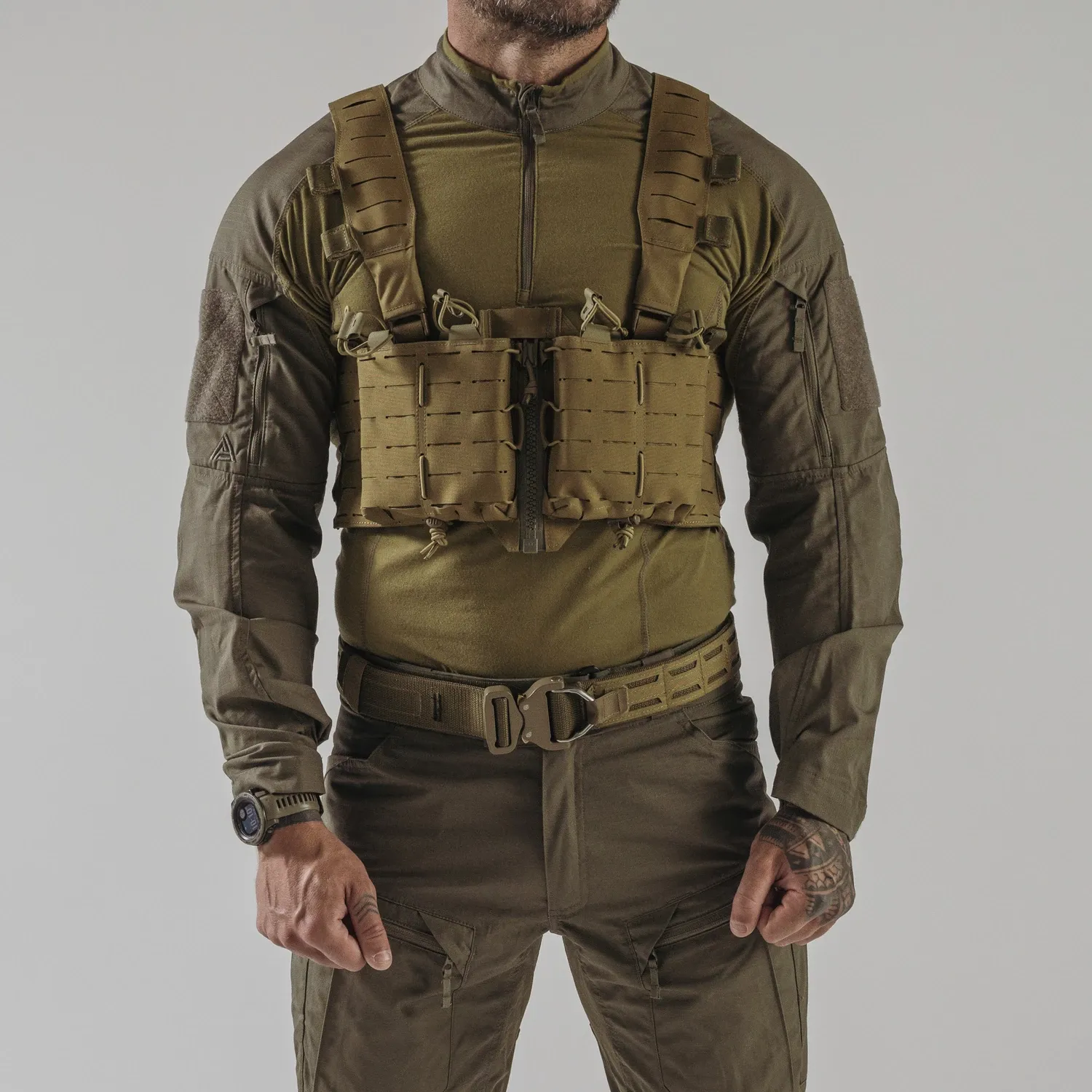 Нагрудное снаряжение TEMPEST® - это одно из наших снаряжений на молнии спереди.жение TEMPEST® - это одно из наших снаряжений на молнии спереди. Основанный на той же платформе, что и HURRICANE®, он был лишен большей части пришивных подсумков, чтобы получить гладкую, но в то же время легкую конструкцию. Единственными оставшимися подсумками являются два регулируемых подсумка для боеприпасов, предназначенных для установки в магазины AR/AK/SR. Вся поверхность снаряжения покрыта модульной системой, совместимой с MOLLE/PALS. На каждой панели имеется закрытый карман на липучке® для хранения плоских предметов, таких как карты, фотографии объектов и т.д. Благодаря съемным, полностью модульным плечевым ремням, TEMPEST® можно прикрепить непосредственно к одному из наших держателей пластин.