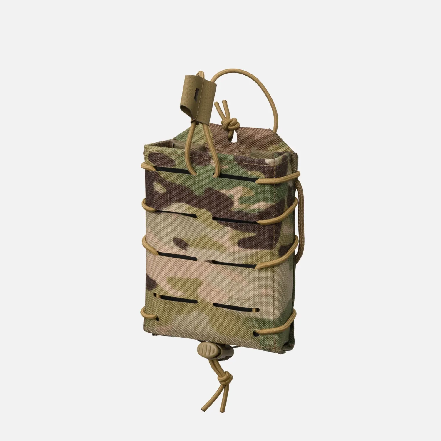 Открытый подсумок предназначен для быстрой смены магазина и обеспечивает полную безопасность транспортировки содержимого. Он предназначен для переноски магазинов серии .308WIN, включая их расширенные версии для системы HK. Внутренняя накладка Hypalon®, жесткая конструкция, регулируемая окружность подсумка и эластичные крепления на шнуре-банджи в верхней части предотвращают выпадение магазинов. Жесткость подсумка позволяет легко вставлять магазин одной рукой. Он совместим с системой MOLLE/PALS, а благодаря специально разработанным петлям из паракорда его также можно закрепить на любом оружейном ремне шириной до 45 мм. Модульная система лазерной резки, совместимая с MOLLE/PALS, размещенная на передней панели подсумка, позволяет укладывать подсумки друг на друга.