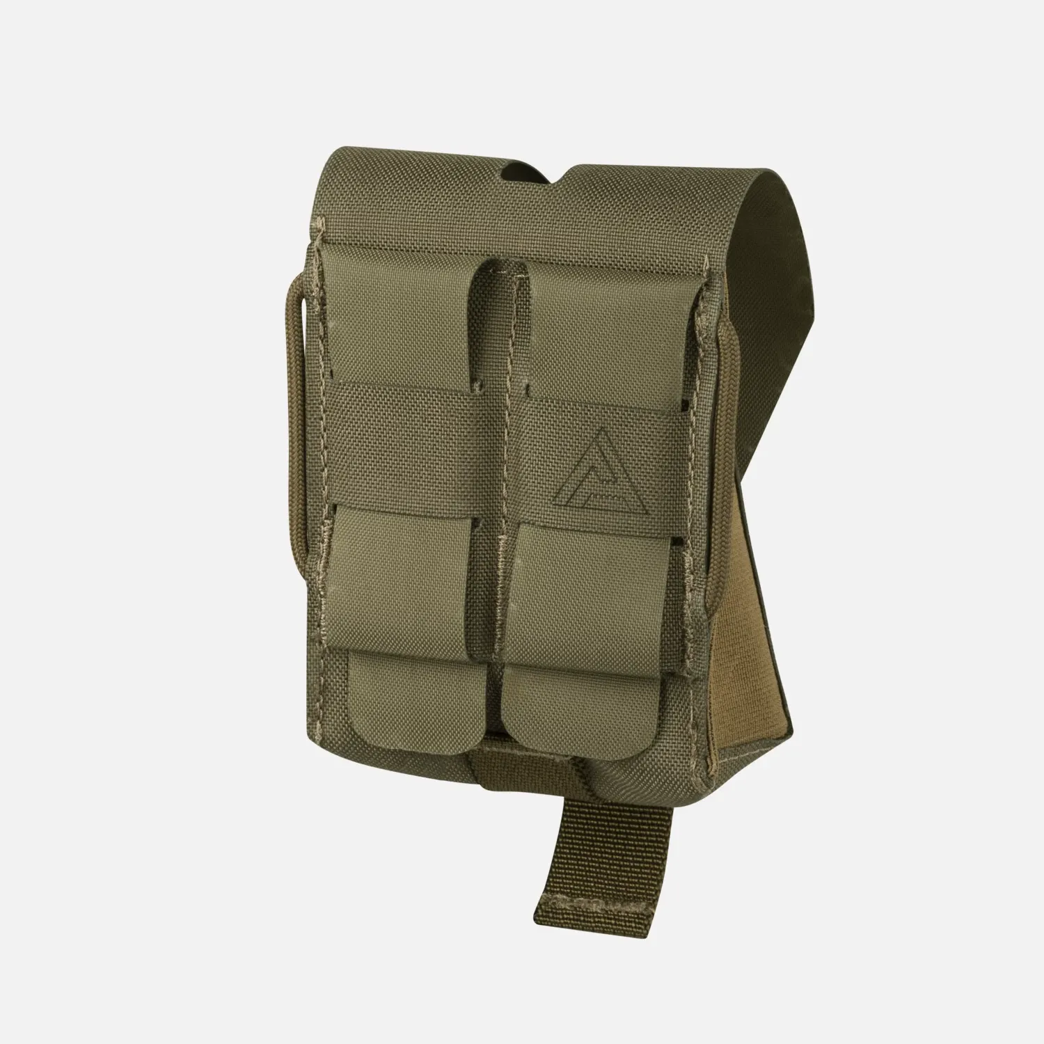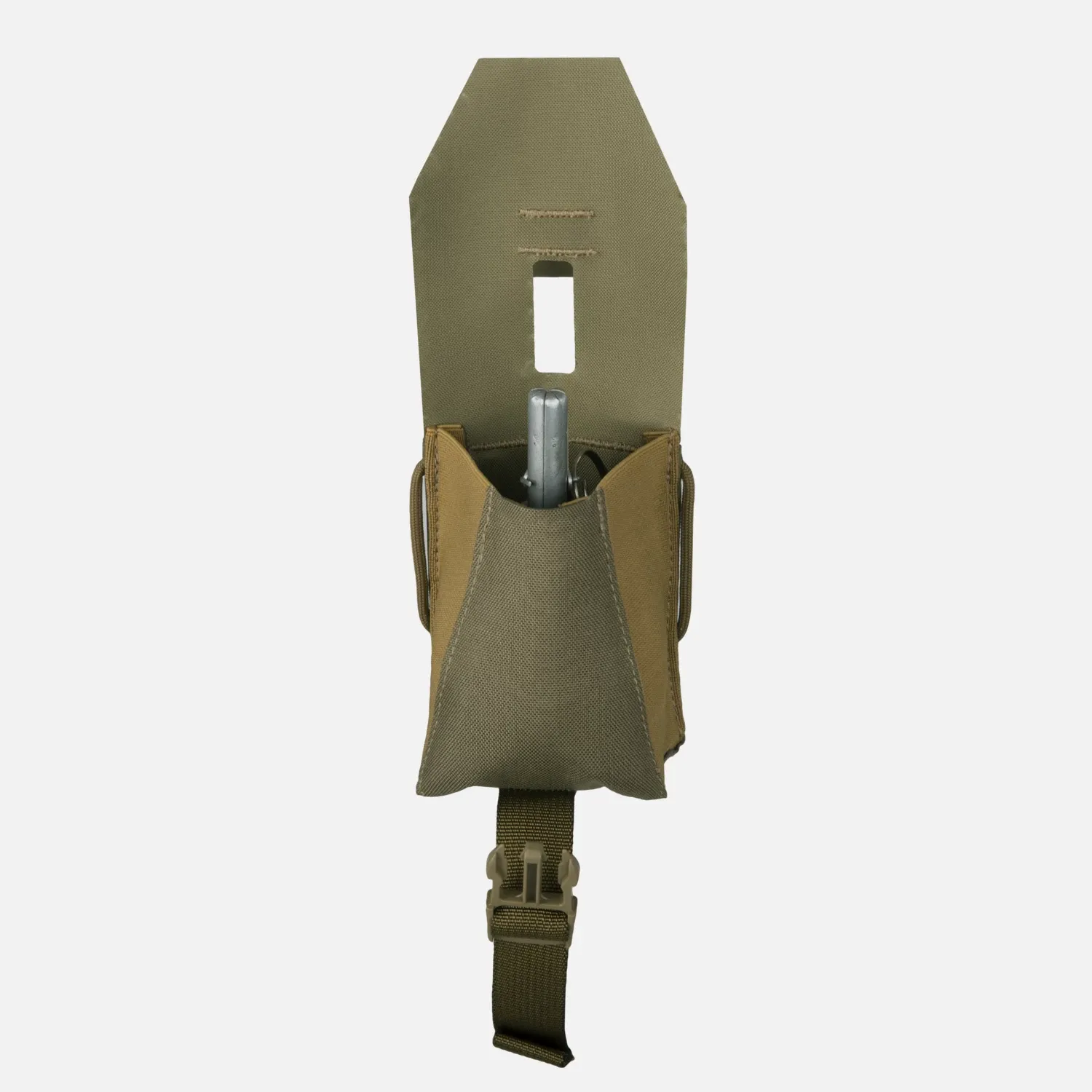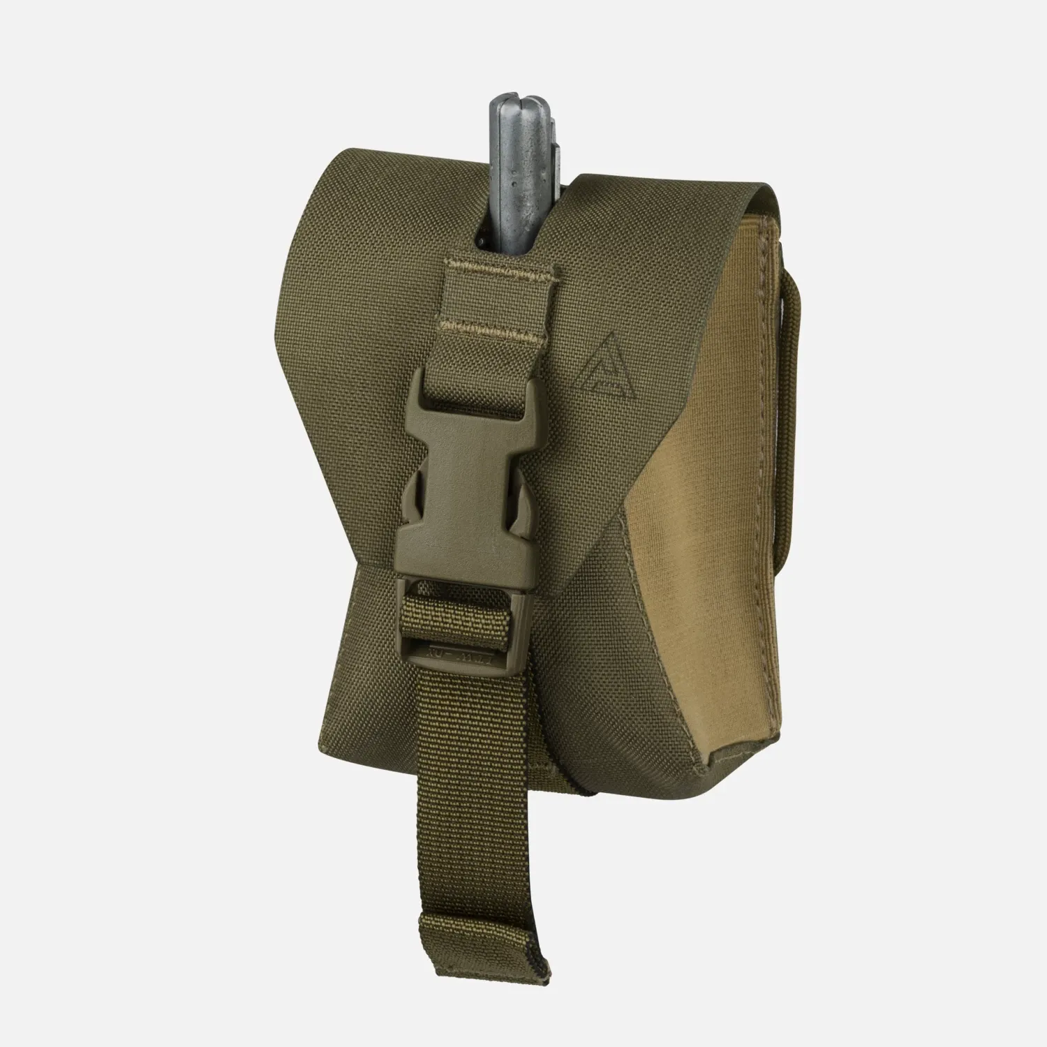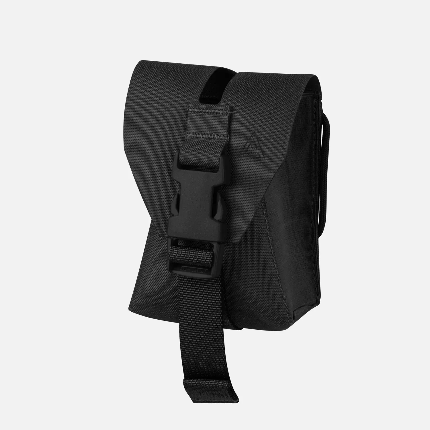 Подсумок для осколочных гранат является развитием нашего первого подсумка для осколочных гранат. Самым важным отличием является замена классической 25-миллиметровой пряжки на меньшую 20-миллиметровую боковую застежку, которая не только более компактна, но и более бесшумна в работе и практически не отличается прочностью. В этом чехле можно носить не только стандартную осколочную гранату американского типа, но и гранаты с запалом UZRGM (например, RG-42, F-1, RDG-5), верхняя часть запала которых выступает через специальное отверстие в клапане. Подсумок не только совместим с модульной системой MOLLE/PALS, но и, благодаря специально разработанным петлям из паракорда, может быть прикреплен к любому оружейному ремню калибра 45 мм.