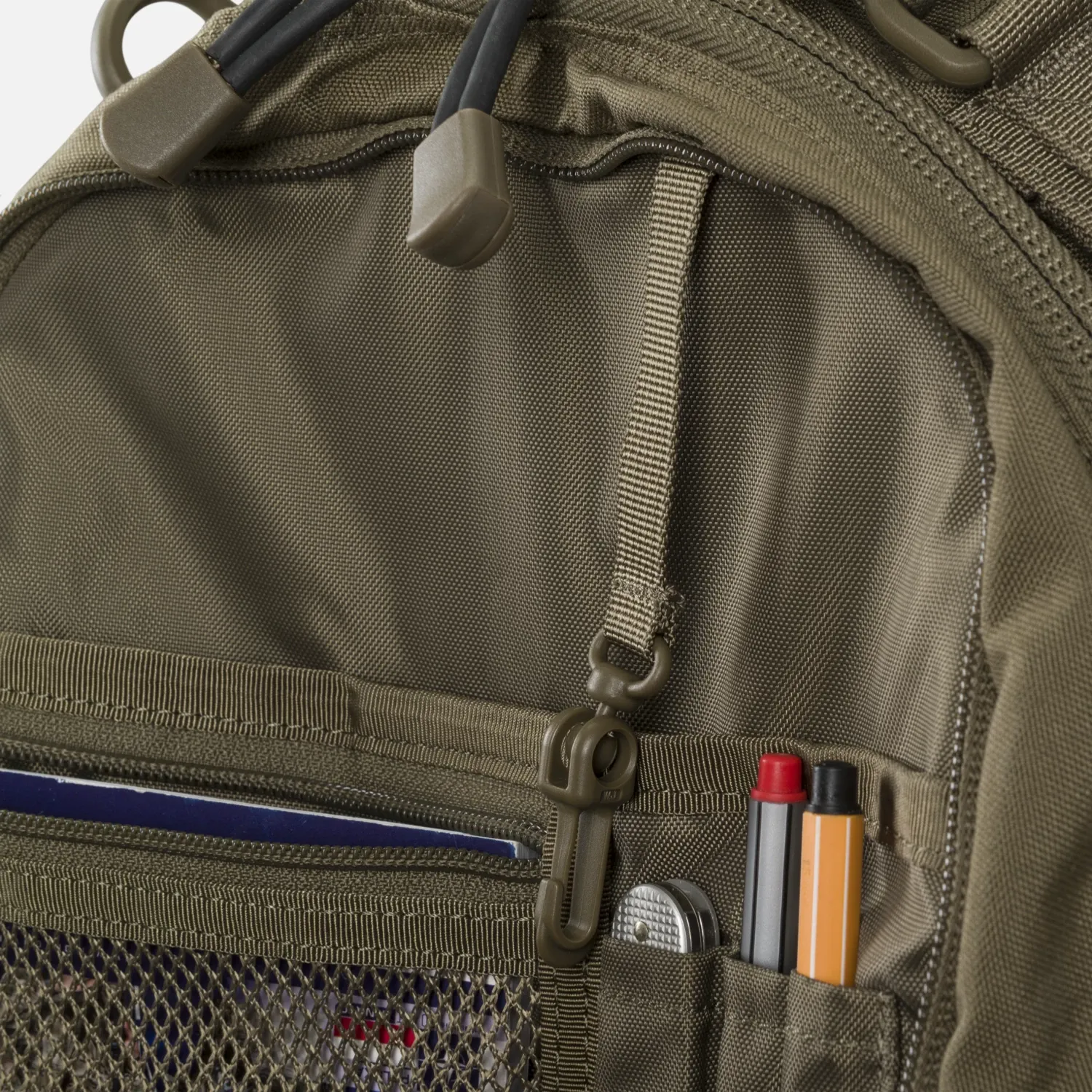 Система MOLLE/PALS с лазерной резкой позволяет дополнять рюкзак дополнительными модулями, не увеличивая его профиль. Спереди имеется перемычка в виде цепочки, которая используется для крепления карабинов, перчаток, жгутов и т.д. Боковые ручки для захвата и верхняя ручка из паракорда облегчают переноску и позволяют использовать шнур (2 × 2,5 м) в экстренных случаях. Быстросъемные плечевые ремни, съемный поясной ремень и усиленная поддержка спины повышают комфорт переноски даже при полной загрузке.